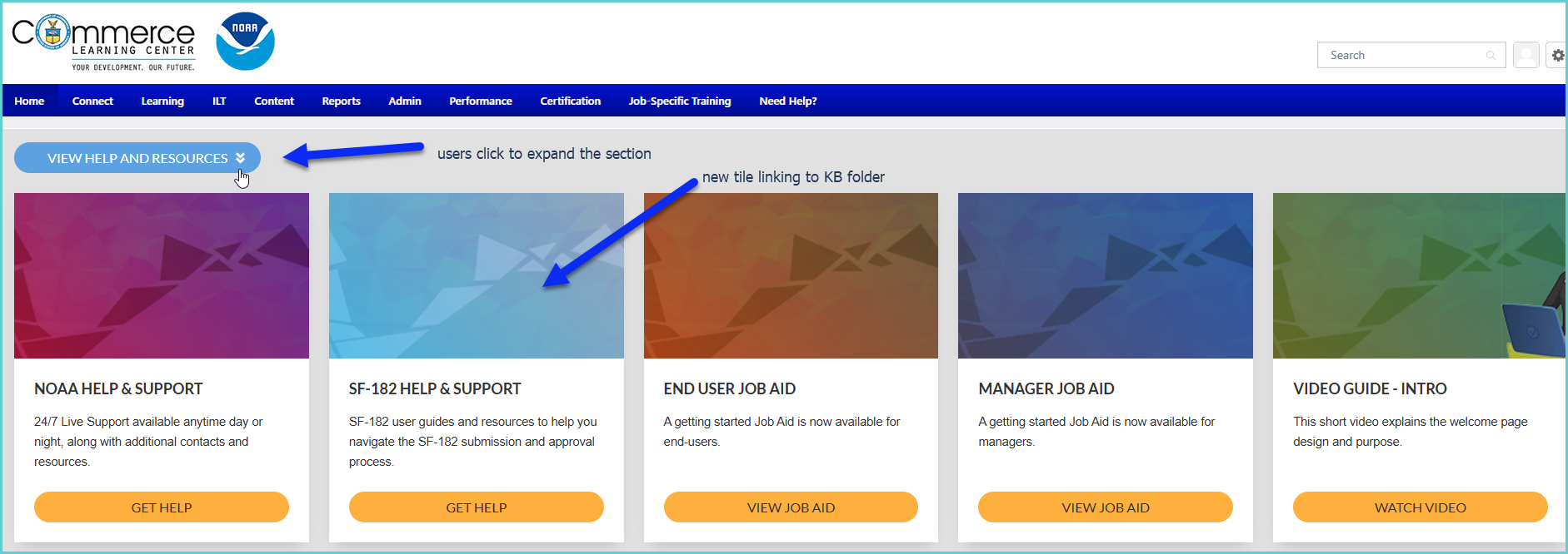 NOAA has implemented its SF-182 Help tile within its recently updated collapsible HELP & RESOURCES section on its home page. The SF-182 HELP tile is linked to a NOAA SF-182 Resources Knowledge Bank folder.
