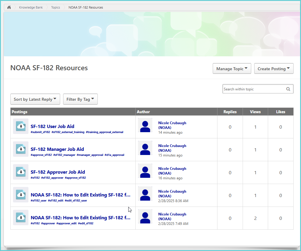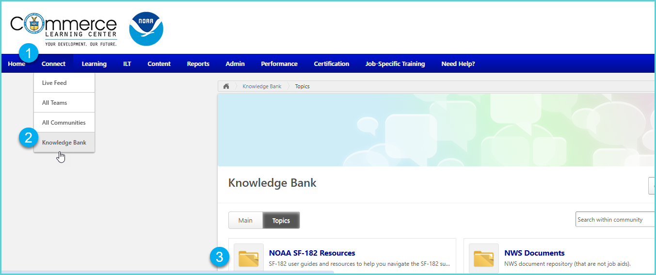 3. You will be redirected to the Knowledge Bank, where you will locate the NOAA SF-182 Resources folder under the Topics section.